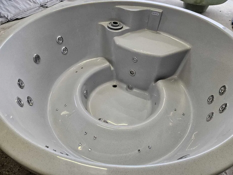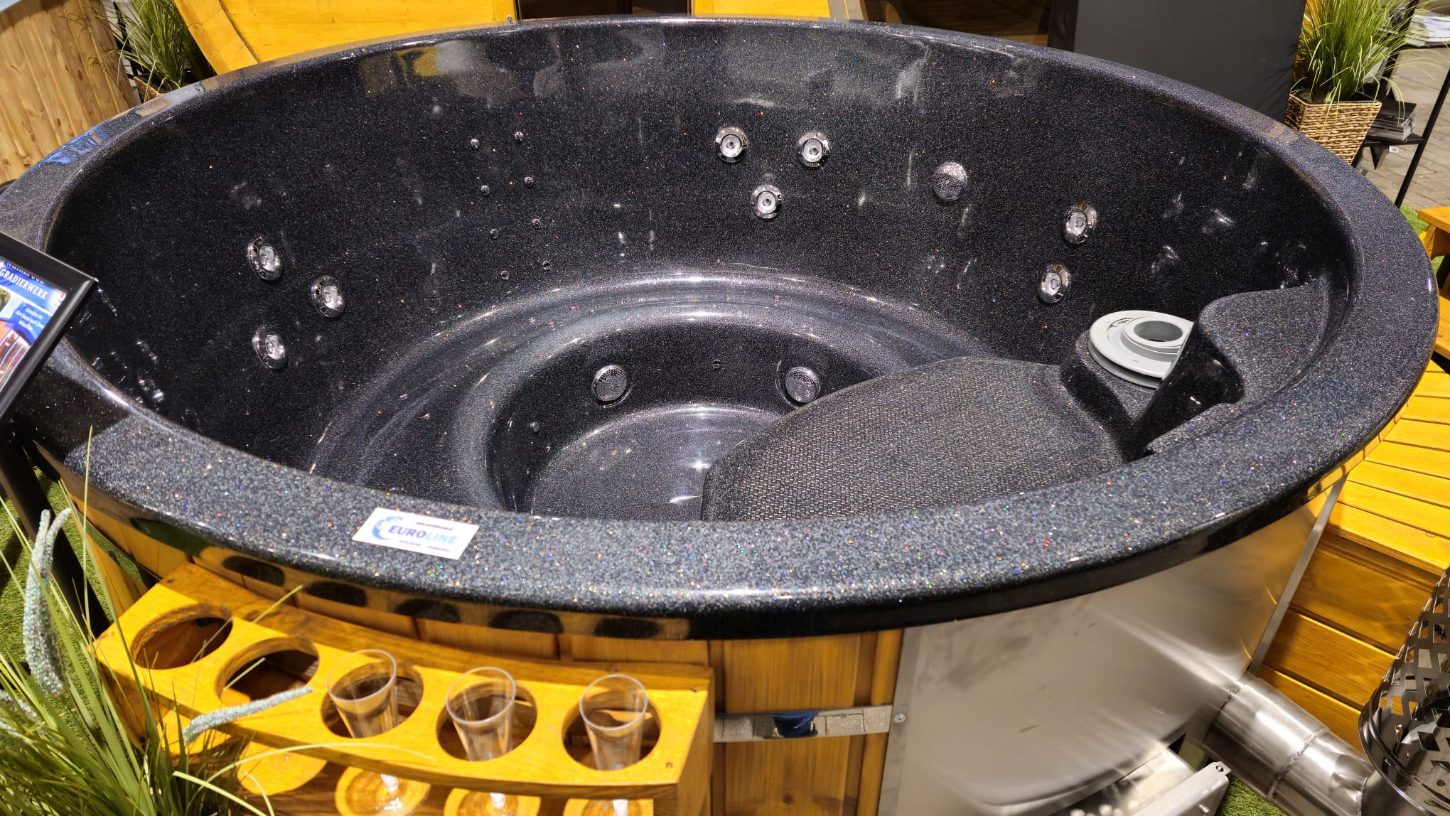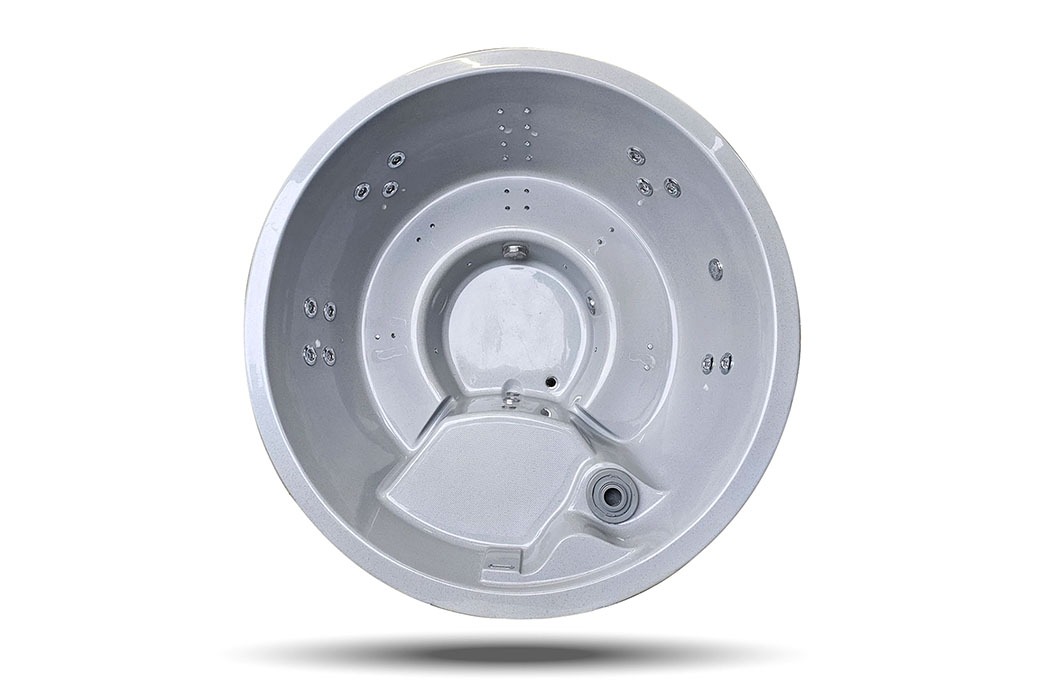 Den runda formen gör att alla sitter bekvämt och kan umgås i samma riktning – perfekt för gemenskap och avslappning. Den stora vattenvolymen på cirka 1400 liter ger en stabil och behaglig badtemperatur.