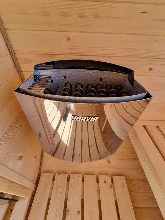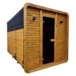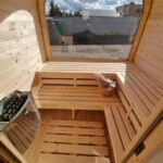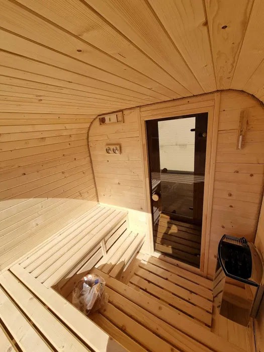 Detta är en finsk bastu, byggd av skandinaviskt C24-granvirke, impregnerat och anpassat för fuktiga miljöer. Bastun är utrustad med 8 mm tonat härdat glas och bekväma bänklösningar som ger plats för 3–6 personer (standard: tvånivåbänkar).