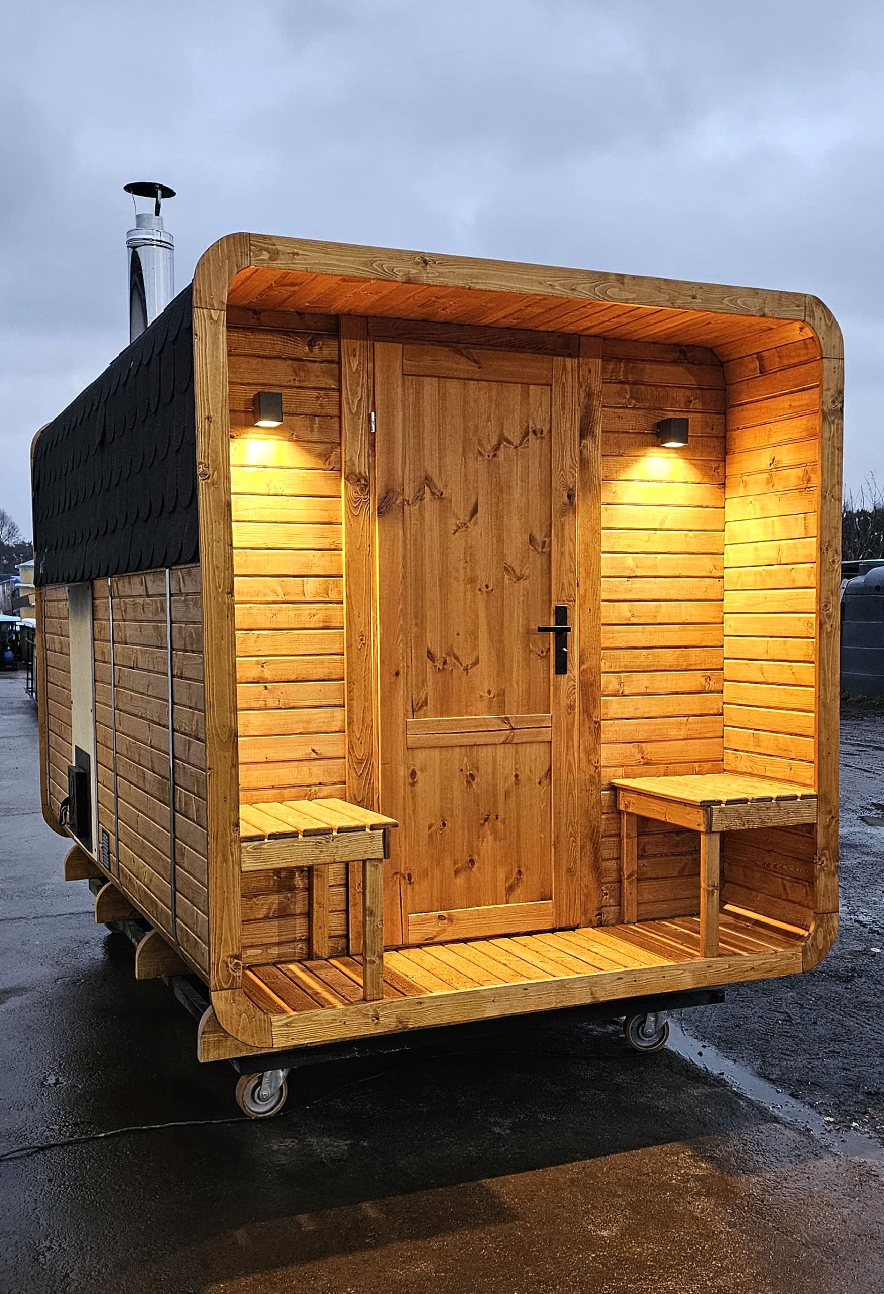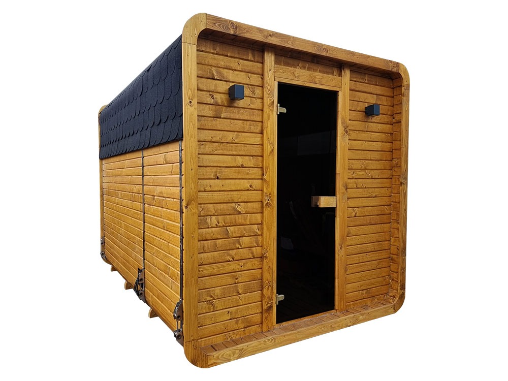Detta är en finsk bastu, byggd av skandinaviskt C24-granvirke, impregnerat och anpassat för fuktiga miljöer. Bastun är utrustad med 8 mm tonat härdat glas och bekväma bänklösningar som ger plats för 3–6 personer (standard: tvånivåbänkar).