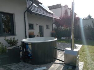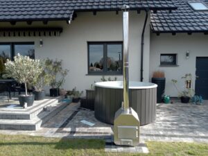 I installationen ingår en integrerad vedeldad kamin i rostfritt stål, som ger en genuin uppvärmning och den där klassiska “spa-känslan” utomhus. Kunden kompletterade dessutom med trappa för smidig i- och urstigning, samt termiskt lock i svart konstläder som hjälper till att hålla värmen och skydda vattnet när badet inte används. Som extra detalj för bekväm användning valdes även click-clack-avlopp, vilket gör tömning och hantering enklare.