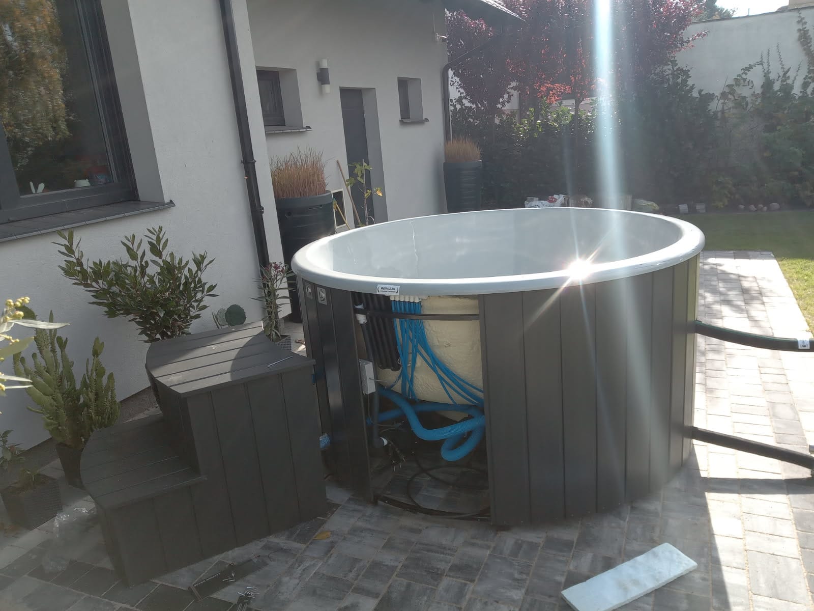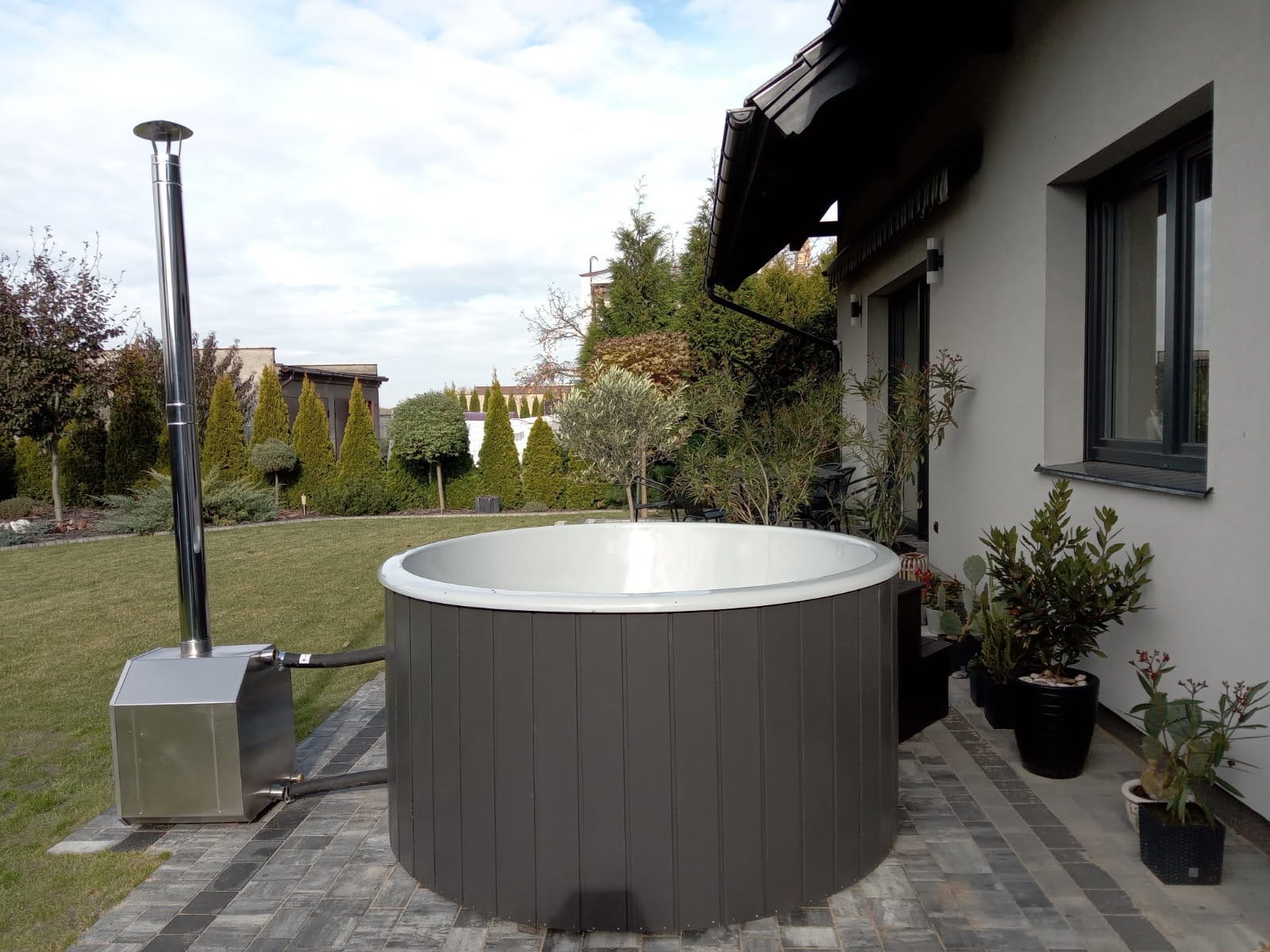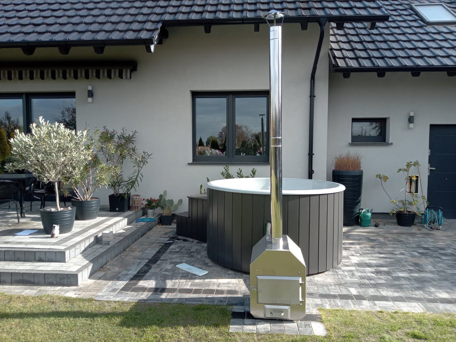 I installationen ingår en integrerad vedeldad kamin i rostfritt stål, som ger en genuin uppvärmning och den där klassiska “spa-känslan” utomhus. Kunden kompletterade dessutom med trappa för smidig i- och urstigning, samt termiskt lock i svart konstläder som hjälper till att hålla värmen och skydda vattnet när badet inte används. Som extra detalj för bekväm användning valdes även click-clack-avlopp, vilket gör tömning och hantering enklare.