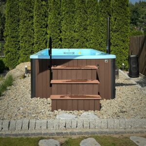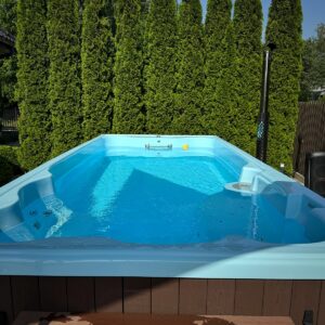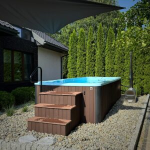 Vi har genomfört en kundbeställning av Pool & Swim Spa – KONGO med måtten 476 × 225 × 120 cm och en vattenvolym på cirka 7,5 m³. Kunden valde en djup och elegant design med blå badkarsfärg i kombination med ytterpanel i komposit (WPC) i kaffebrun nyans, vilket ger ett exklusivt och modernt uttryck i trädgårdsmiljön.