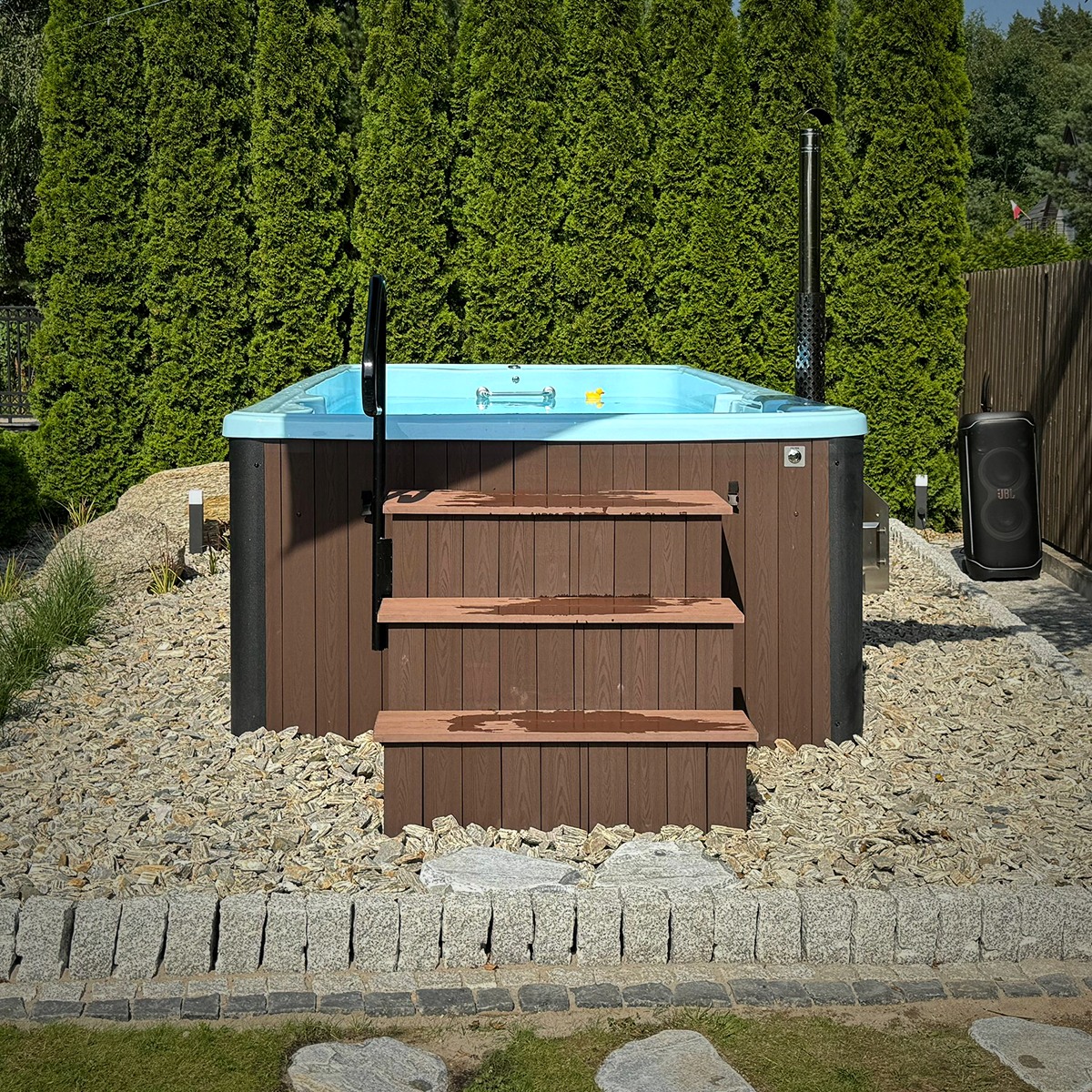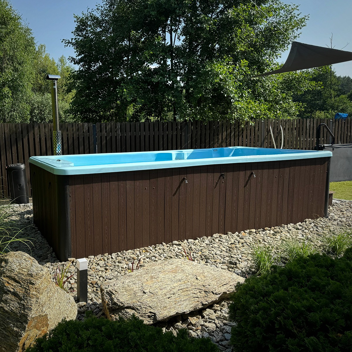 Vi har genomfört en kundbeställning av Pool & Swim Spa – KONGO med måtten 476 × 225 × 120 cm och en vattenvolym på cirka 7,5 m³. Kunden valde en djup och elegant design med blå badkarsfärg i kombination med ytterpanel i komposit (WPC) i kaffebrun nyans, vilket ger ett exklusivt och modernt uttryck i trädgårdsmiljön.