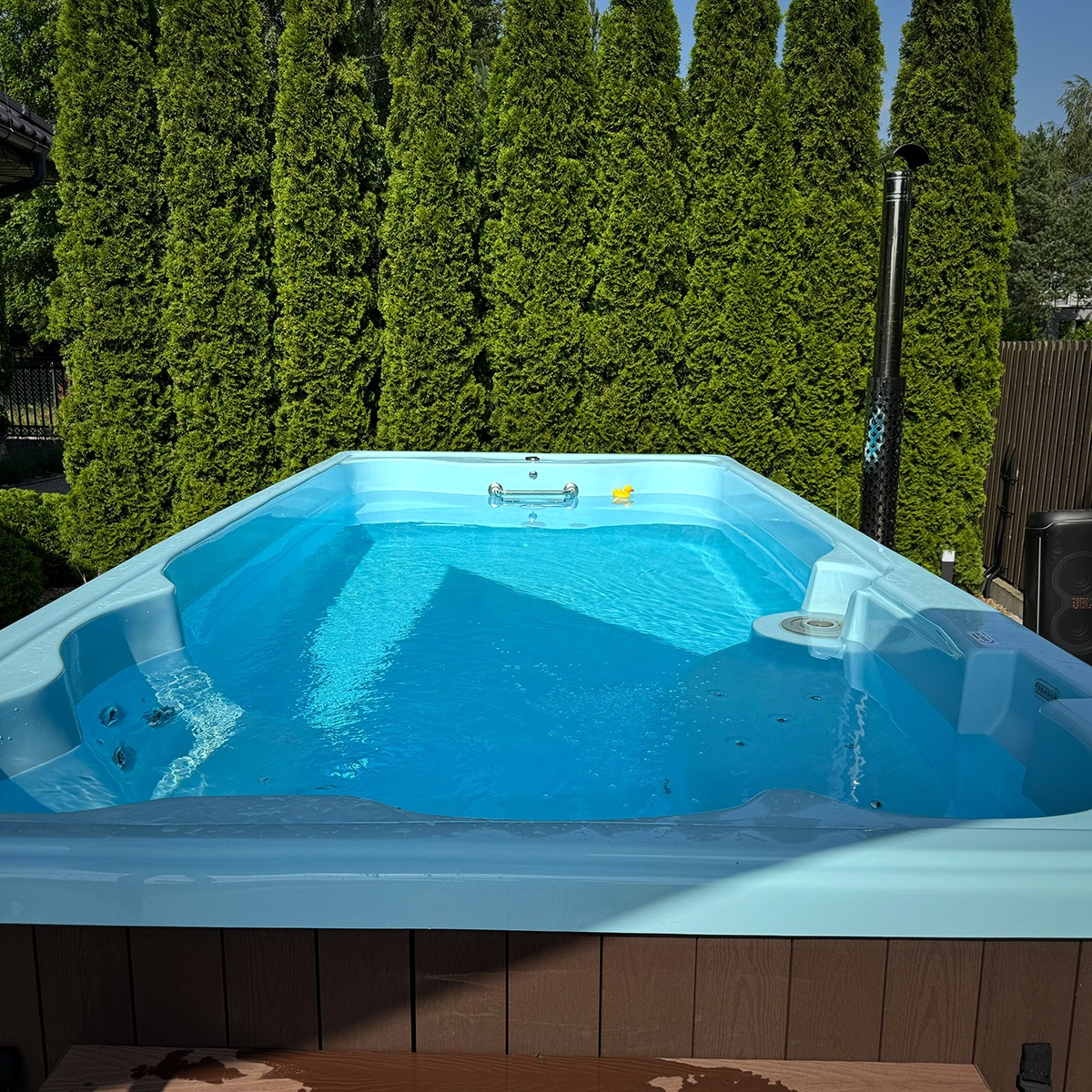 Genomfört projekt av Pool & Swim Spa KONGO i blå och kaffebruna nyanser, utrustat med motström för aktiv simning och energieffektiv värmepump Aquaviva A-7. Komplett med lufthydromassage, LED-belysning och isolering för helårsbruk. Leverans direkt till kundens adress inom 32 dagar.